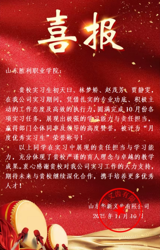 近日,我院收到来自山东华新义齿有限公司的喜报,祝贺我院实习生初天曰、林梦娇、赵茂芳、贾静雯四位同学在实习期间表现优异,荣获该公司“月度优秀实习生”荣誉称号。喜报中指出,四位同学在实习期间展现出扎实的专业基础、积极主动的工作态度和高效的执行力,圆满完成了10月份的实习任务,赢得了部门全体同事及领导的高度认可。他们的优异表现,不仅体现了个人优秀的职业素养,也充分展现了我院严谨育人、注重实践的教学成果...