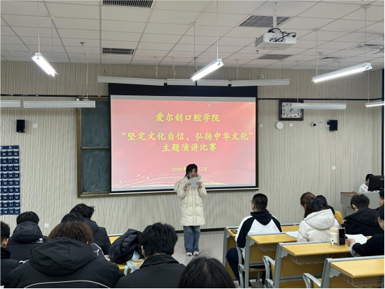 为深入学习贯彻党的二十大精神,传承弘扬中华优秀传统文化,引导青年学子筑牢文化自信根基,12月12日下午,爱尔创口腔学院在修业楼111教室成功举办“坚定文化自信,弘扬中华文化”主题演讲比赛。学院在校学生积极参与,以演讲为媒,抒文化之情,展青年之志。
