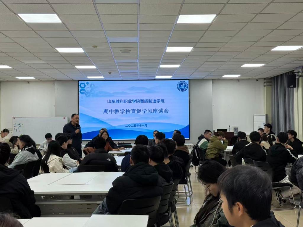 为强化学风建设、助力学生早日成材,山东胜利职业学院智能制造学院于2025年11月12日、13、16日连续三天召开期中教学检查“促学风 助成才”座谈会。座谈会聚焦学生学业发展核心需求,围绕课堂教学质量提升、专升本备考规划、技能证书获取路径及就业创业指导等议题展开深入探讨,旨在通过倾听学生心声,了解学生诉求,推动“以学生为中心”的教育理念落地。