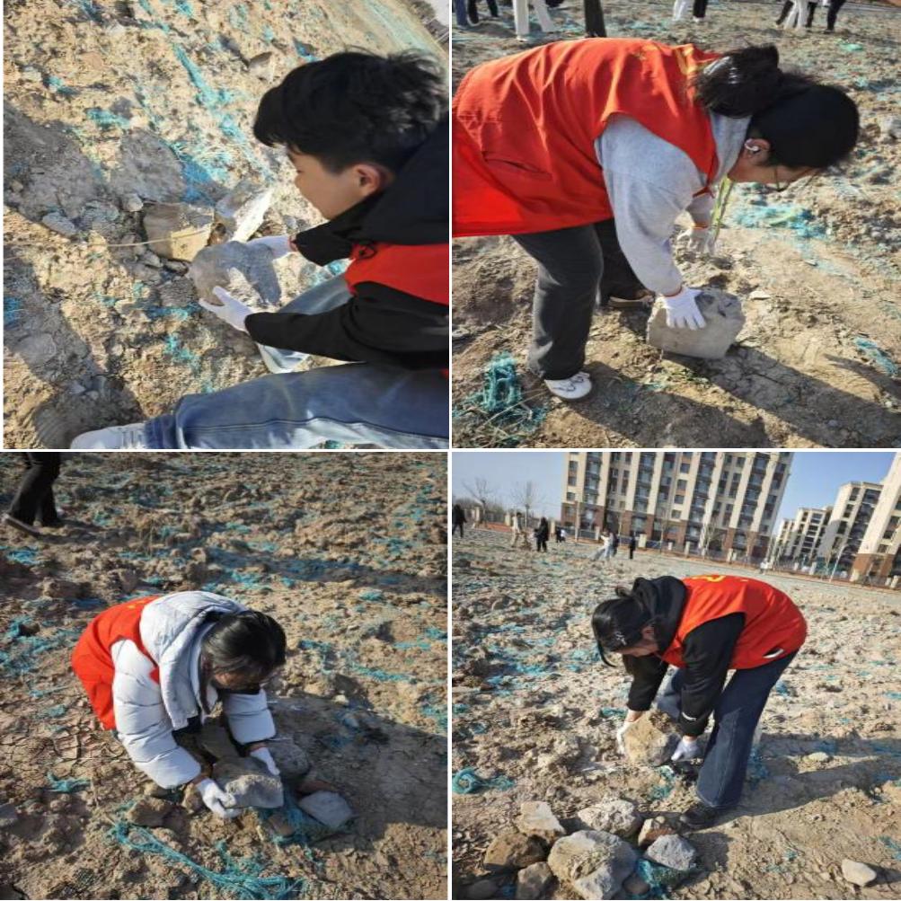 活动现场,志愿者们身着红色志愿马甲,戴着手套,分工协作、干劲十足。大家不畏尘土,弯腰俯身,将散落在土地上的石块、砖块逐一捡拾、搬运至指定区域。尽管地面崎岖、石块沉重,同学们依旧热情高涨,相互配合、接力传递,不放过任何一处角落,不留下一块碎石。从单人搬运到多人协作,从细致捡拾到有序堆放,每一个动作都展现出胜职酒管学子吃苦耐劳、团结协作的志愿精神。