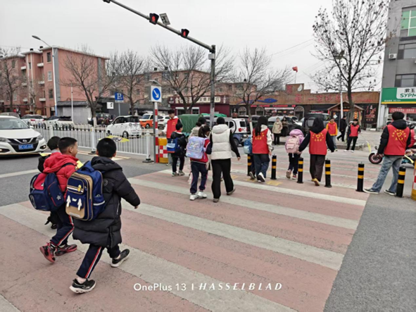 当日 16:00,志愿者们准时在校门口集合,接受岗前培训与安全提醒。16:30 放学高峰来临之际,大家身着统一红色志愿马甲,迅速抵达各执勤点位,有序开展引导服务。