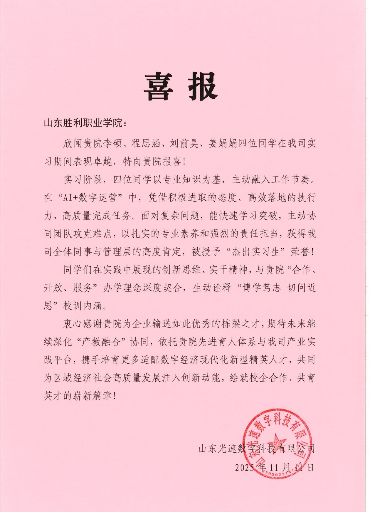近日,智能制造学院23级多名实习学生凭借扎实的专业功底和出色的工作表现,获得合作企业的一致好评。企业通过感谢信、喜报等形式,对学生在岗位上的表现给予充分肯定。