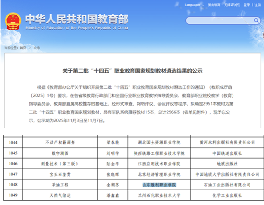 近日,教育部办公厅发布“关于第二批“十四五”职业教育国家规划教材遴选结果的公示”。由我院书记、院长金潮苏担任主编的教材《采油工程》历经多轮严格评审,成功入选,这是我院在教材建设与教育教学改革领域取得的又一重大国家级成果。
