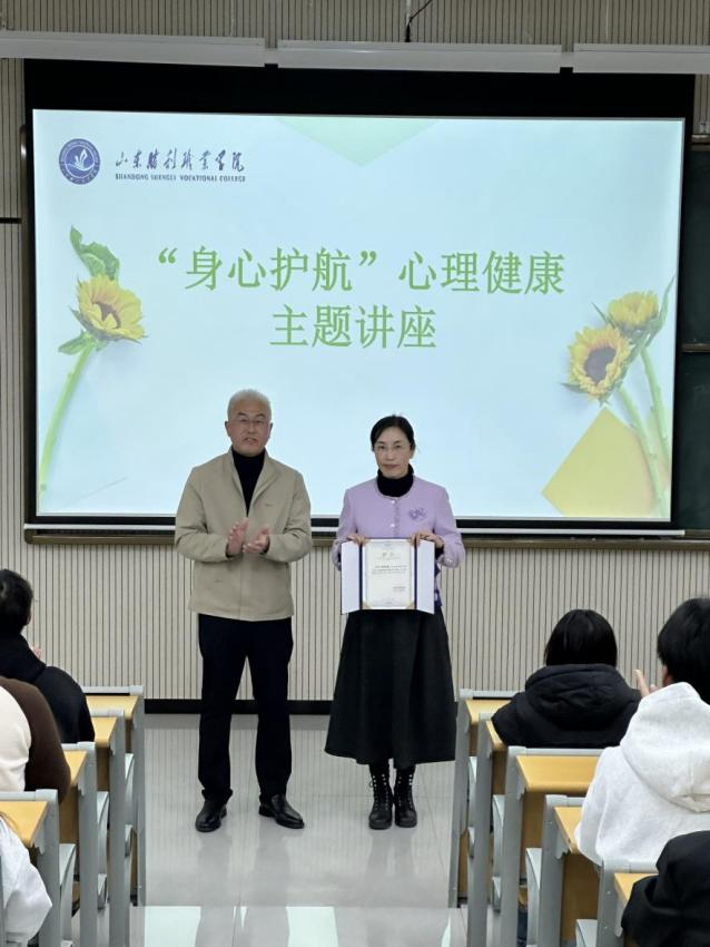为加强学生心理健康教育,护航学子职业生涯发展,近日,我校在“职业生涯我做主,成长航线我绘制”职业体验成长赋能系列活动框架下,成功举办“身心护航”心理健康主题讲座。活动由学工处组织,各班级心理委员及宿舍“晴雨观察员”共同参与。讲座特邀东营市精神卫生中心费艳艳教授主讲。活动现场,学工处张忠伟处长为费艳艳教授颁发“大学生心理健康教育特聘专家”聘书,进一步壮大了我校心理健康教育的专业力量。费教授以“大...